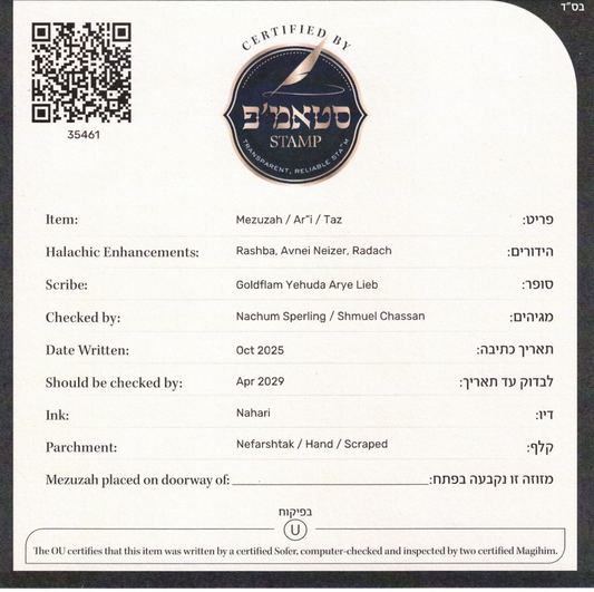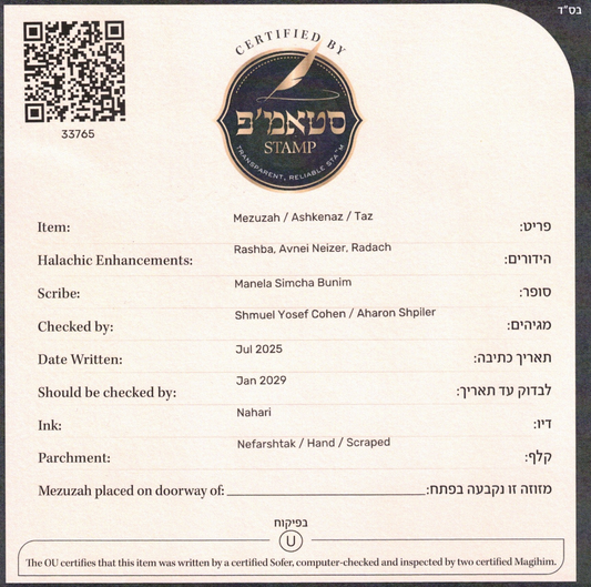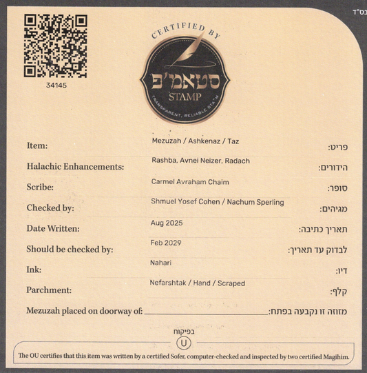 Mezuzah OU certified Written by Sofer - Rabbi Avraham chaim Carmel- B"Y Ashkenaz