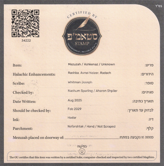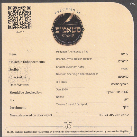 Mezuzah OU Certified - Sofer Rabbi Yisrael Stern - Ar"i - 6''