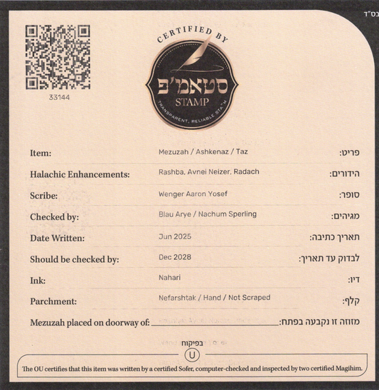 Mezuzah OU certified Written by Sofer - Rabbi Aron Yosef Wenger- B"Y Ashkenaz