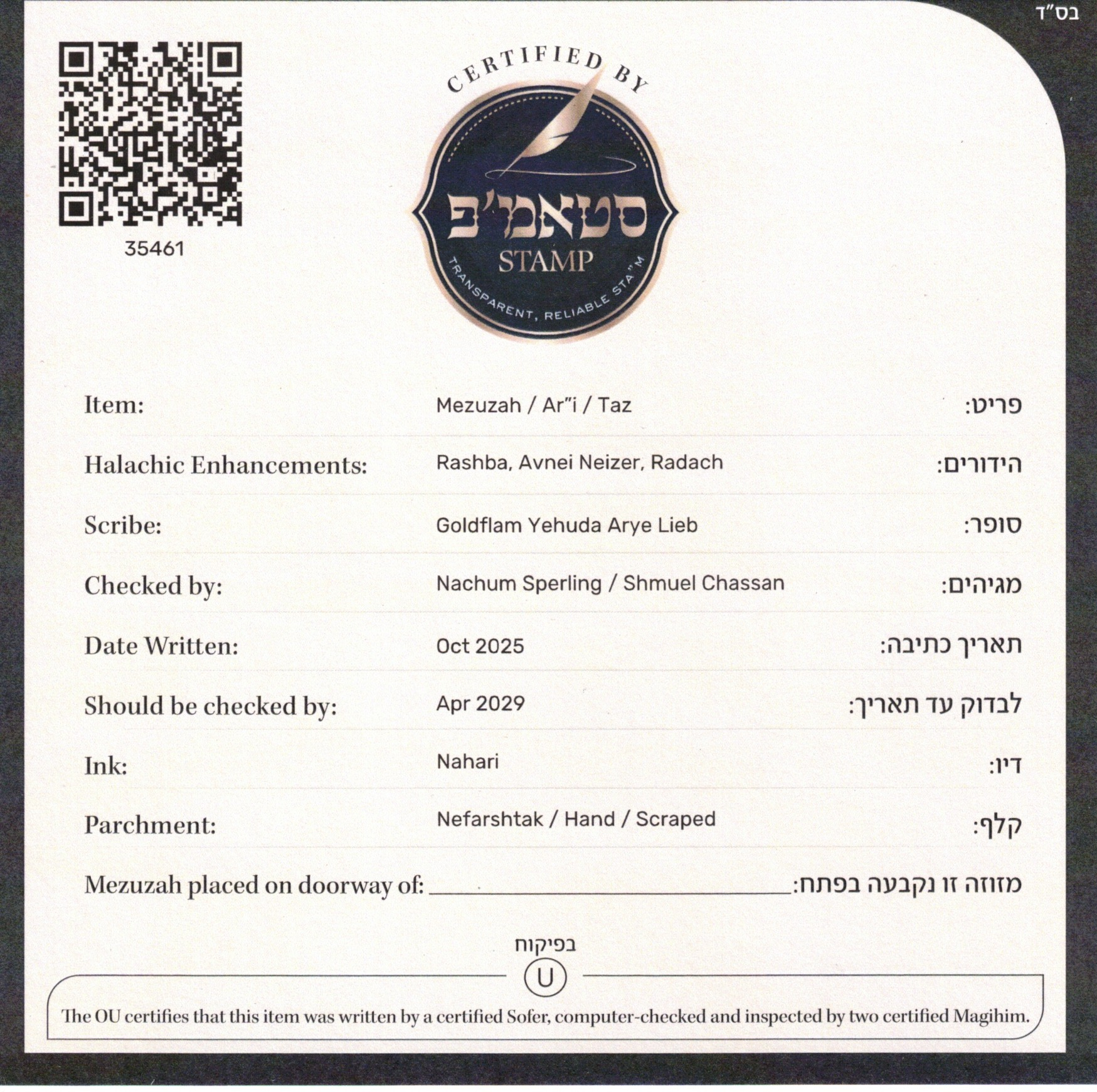 This Mezuza is certified by the OU and its partners. It was written by a certified Sofer Rabbi Yehudah A. Leib Goldflam, the klaf and the ink used came from reputable providers, and the mezuzos themselves have been checked by two separate certified Magi'im, Additionally, the mezuzos have undergone an AI powered computer check, which confirmed that they were written by the Sofer and checked them for errors.