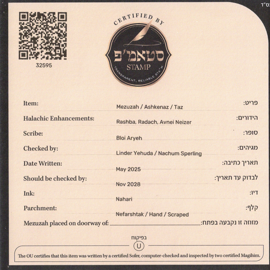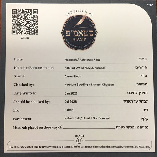 Mezuzah OU Certified Sofer Rabbi Aryeh Bloi B"Y - Ashkenaz - 6''
