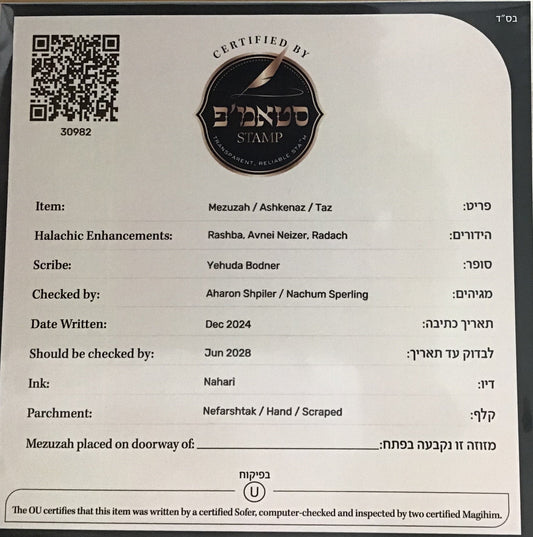Mezuzah OU Certified - Sofer R' Yehudah Bodner - Ashkenaz - 6''