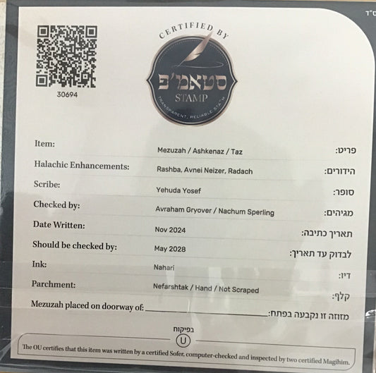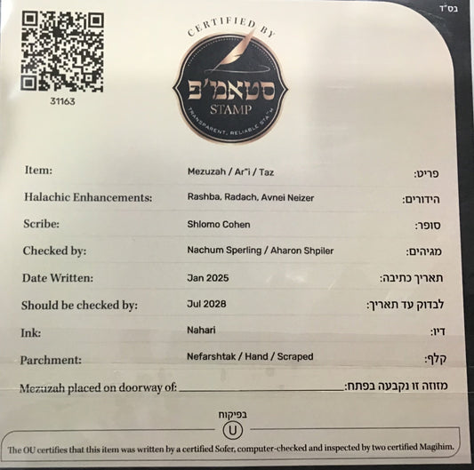 Mezuzah OU Certified - Sofer Rabbi Yisrael Stern - Ar"i - 6''
